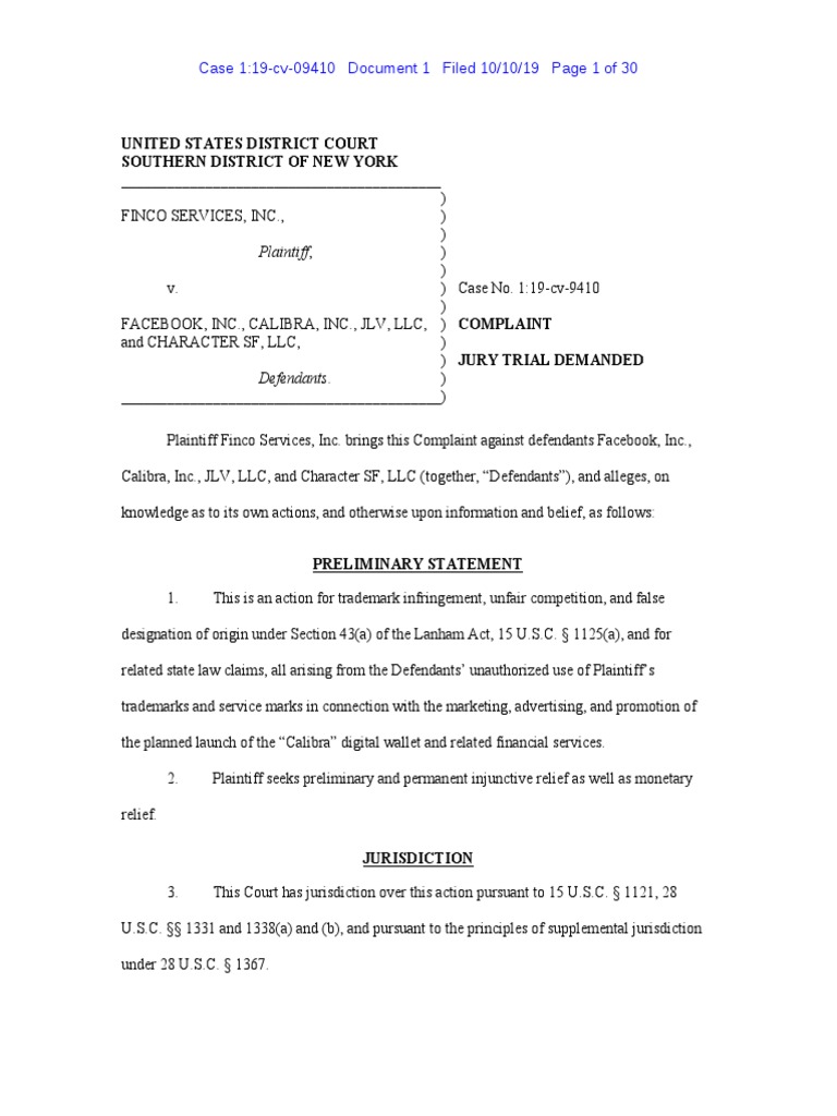 Plaintiff Finco Services, Inc. brings this Complaint against defendants Facebook, Inc.,