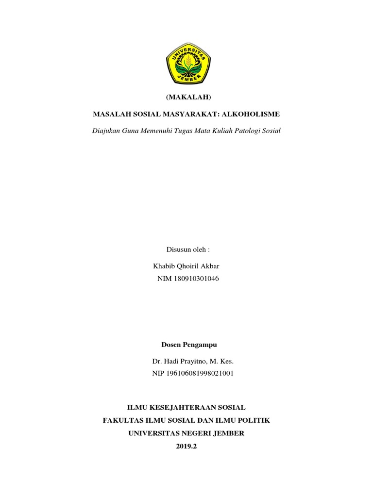 MASALAH SOSIAL MASYARAKAT : ALKOHOLISME.Maka dalam makalah tersebut