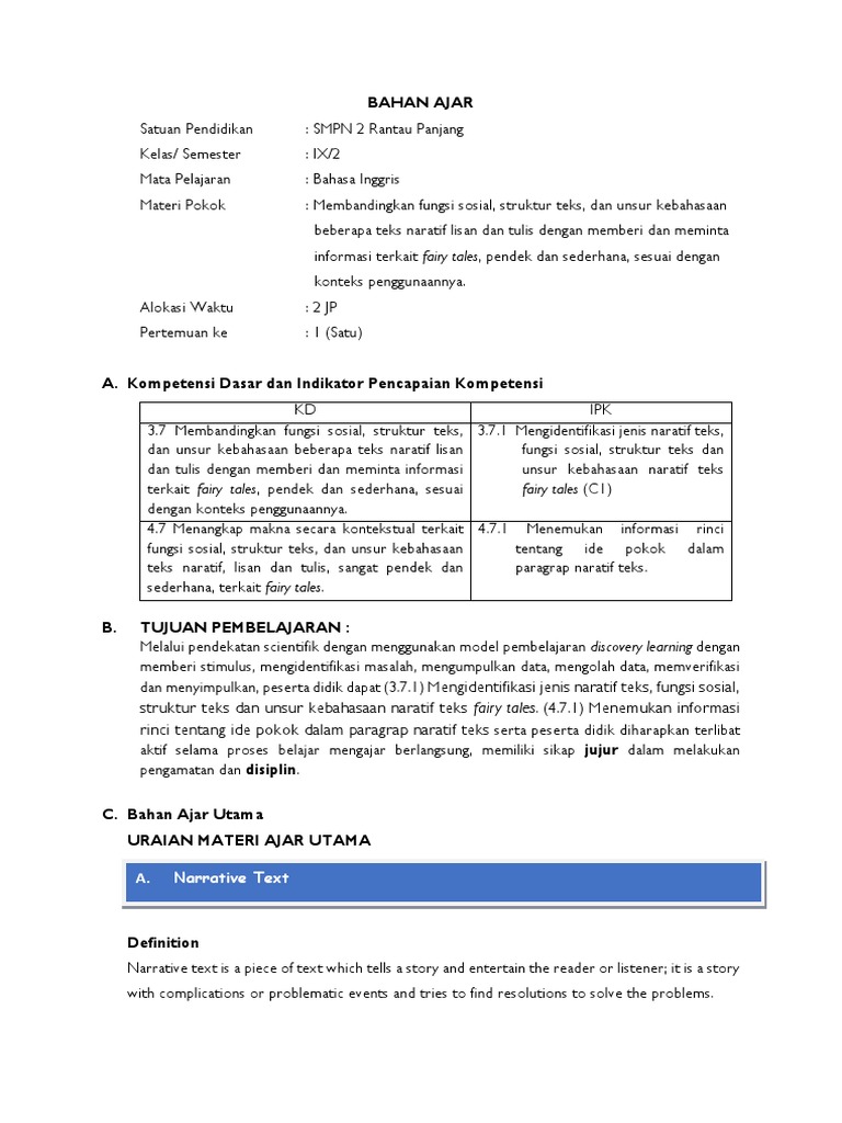 1. Peserta didik diminta untuk mengidentifikasi jenis naratif teks, fungsi social, struktur teks dan unsur