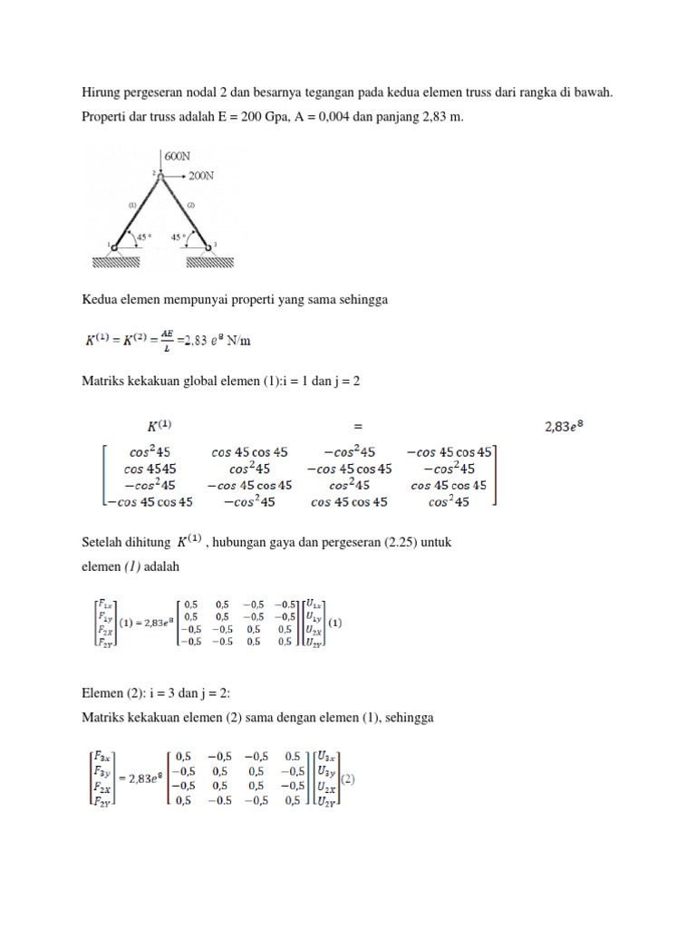 Properti dar truss adalah E = 200 Gpa, A = 0,004 dan panjang 2,83 m.