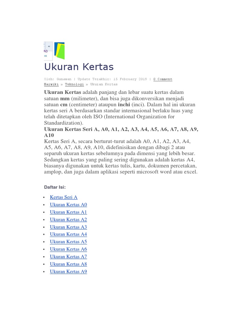 Ukuran Kertas adalah panjang dan lebar suatu kertas dalam