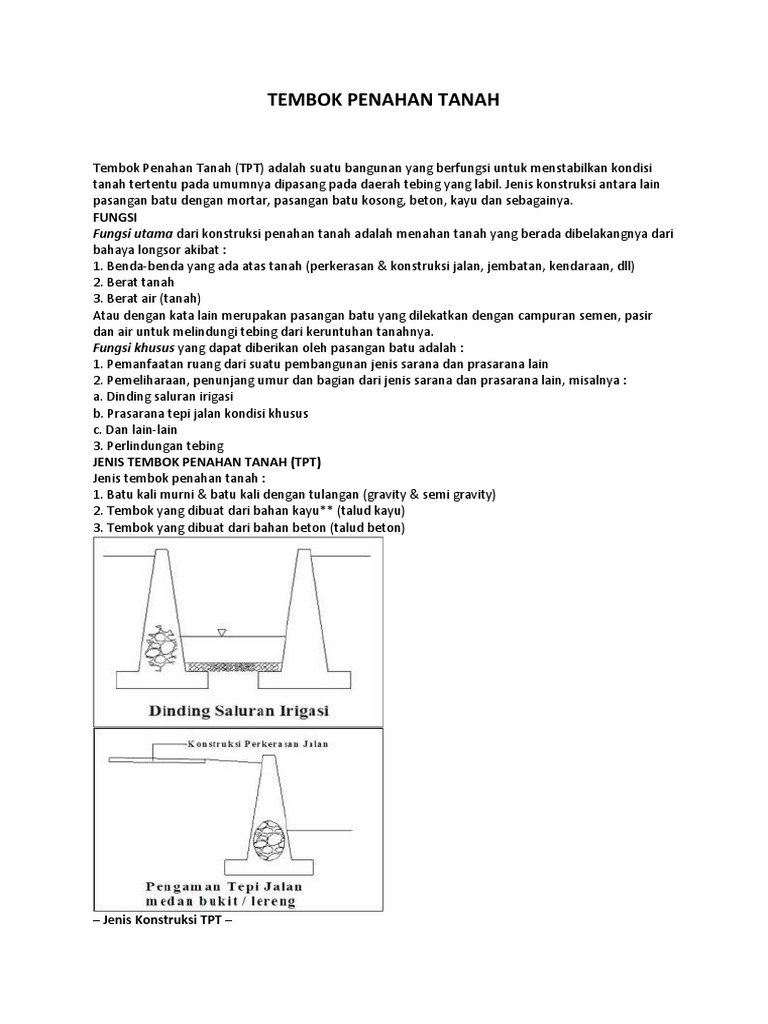 Tembok Penahan Tanah (TPT) adalah suatu bangunan yang berfungsi untuk menstabilkan kondisi