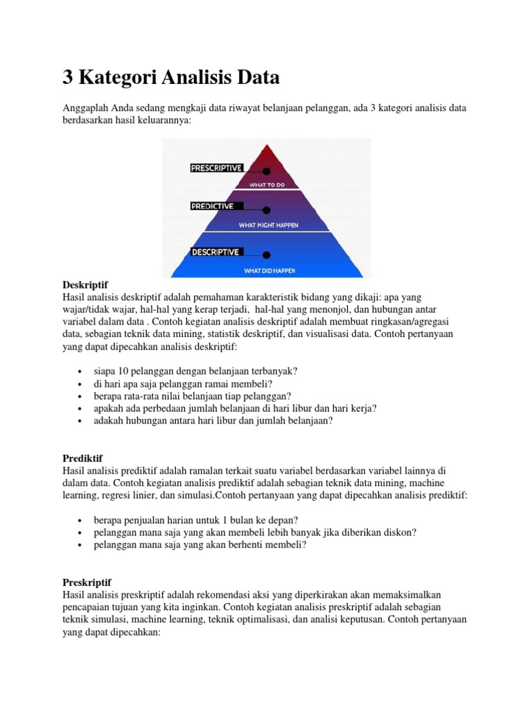 data, sebagian teknik data mining, statistik deskriptif, dan visualisasi data. Contoh pertanyaan