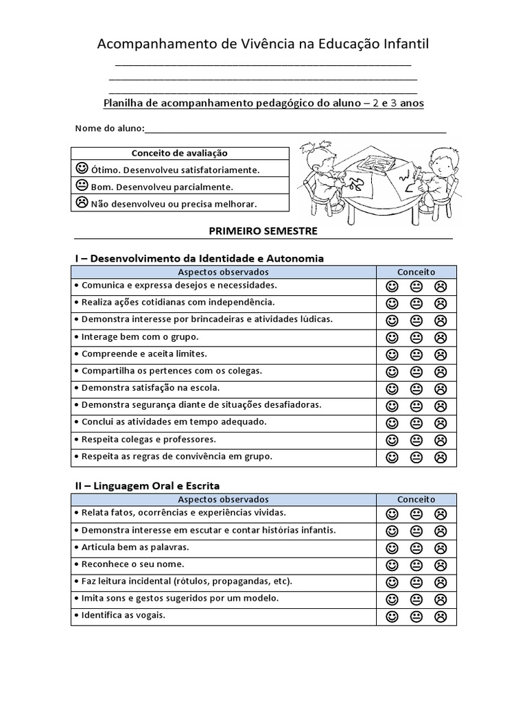Planilha de acompanhamento pedagógico do aluno – 2 e 3 anos
