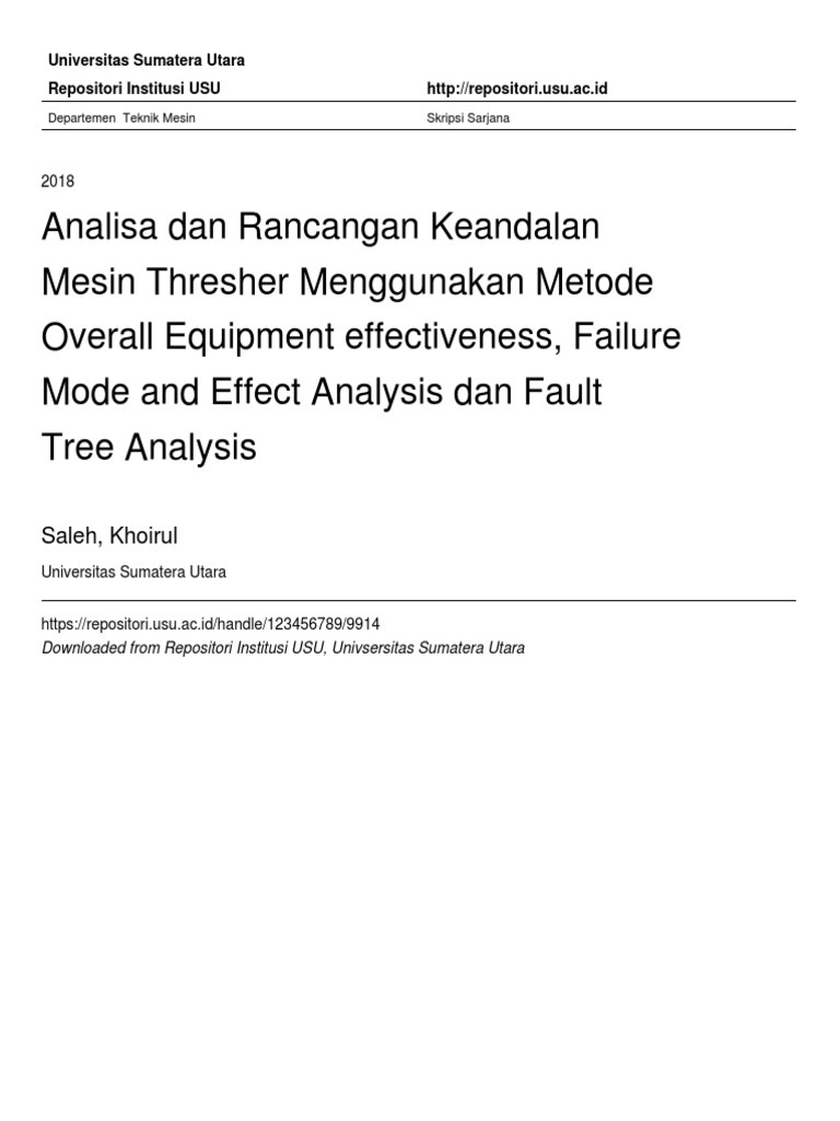Kata kunci: Thresher, Overall Equipment Effectivenes, FMEA, ANOVA, dan FTA.