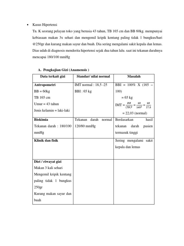 Tn. K seorang pelayan toko yang berusia 43 tahun, TB 165 cm dan BB 60kg. mempunyai