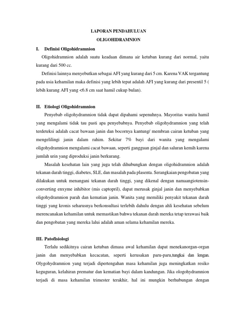 ketubannya sangat sedikit atau tidak ada. Oligohidramnion menyebabkan bayi tidak memiliki