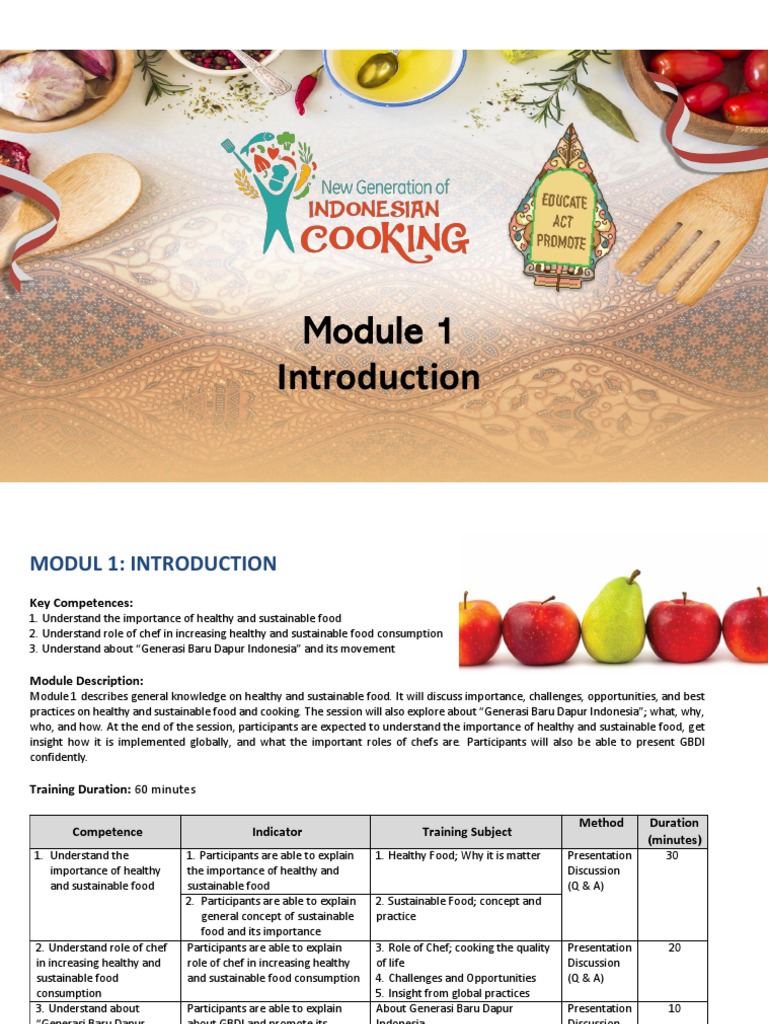 Module 1 describes general knowledge on healthy and sustainable food . It will discuss importance, challenges, opportunities, and best