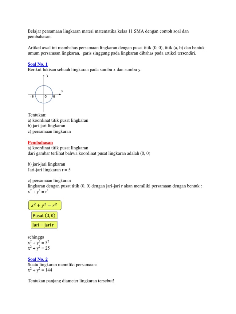 Artikel awal ini membahas persamaan lingkaran dengan pusat titik (0, 0), titik (a, b) dan bentuk