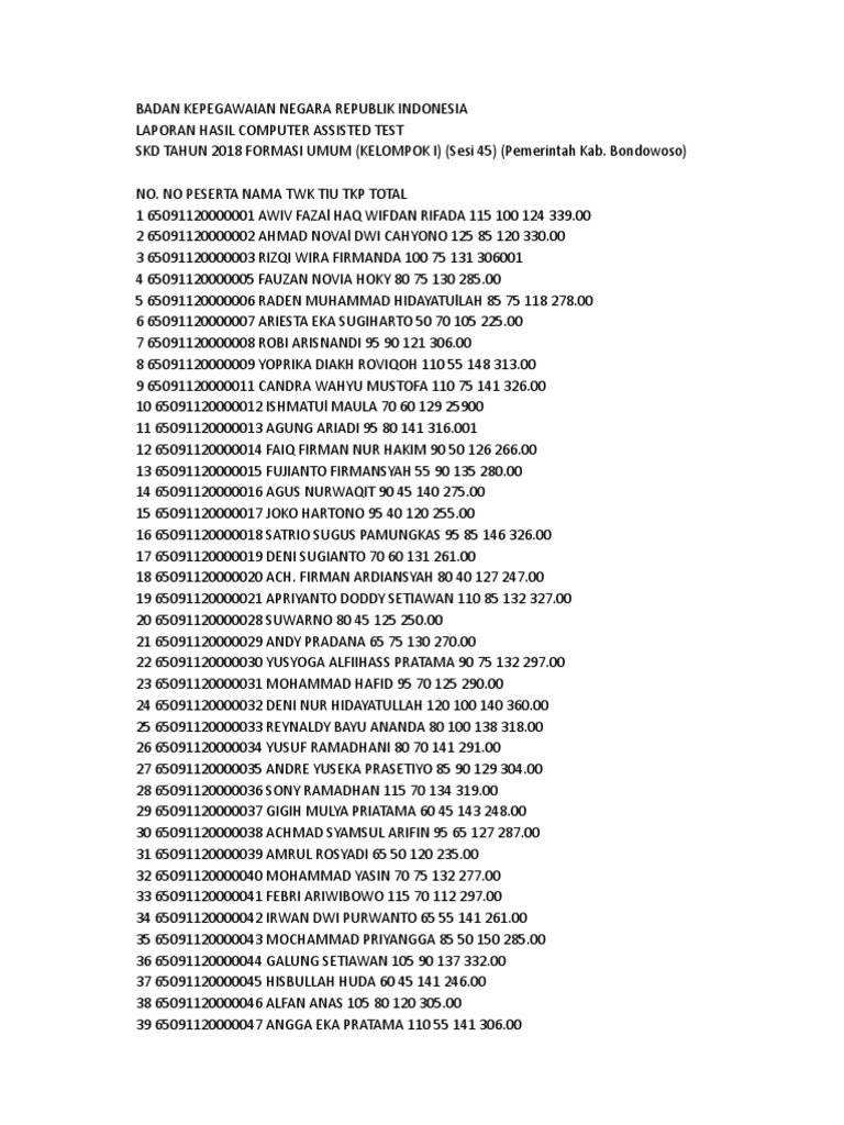 SKD TAHUN 2018 FORMASI UMUM (KELOMPOK I) (Sesi 45) (Pemerintah Kab. Bondowoso)