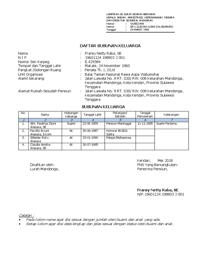 Setiap kolom agar diisi data lengkap dan jelas sesuai dengan status isteri/suami dan anak.