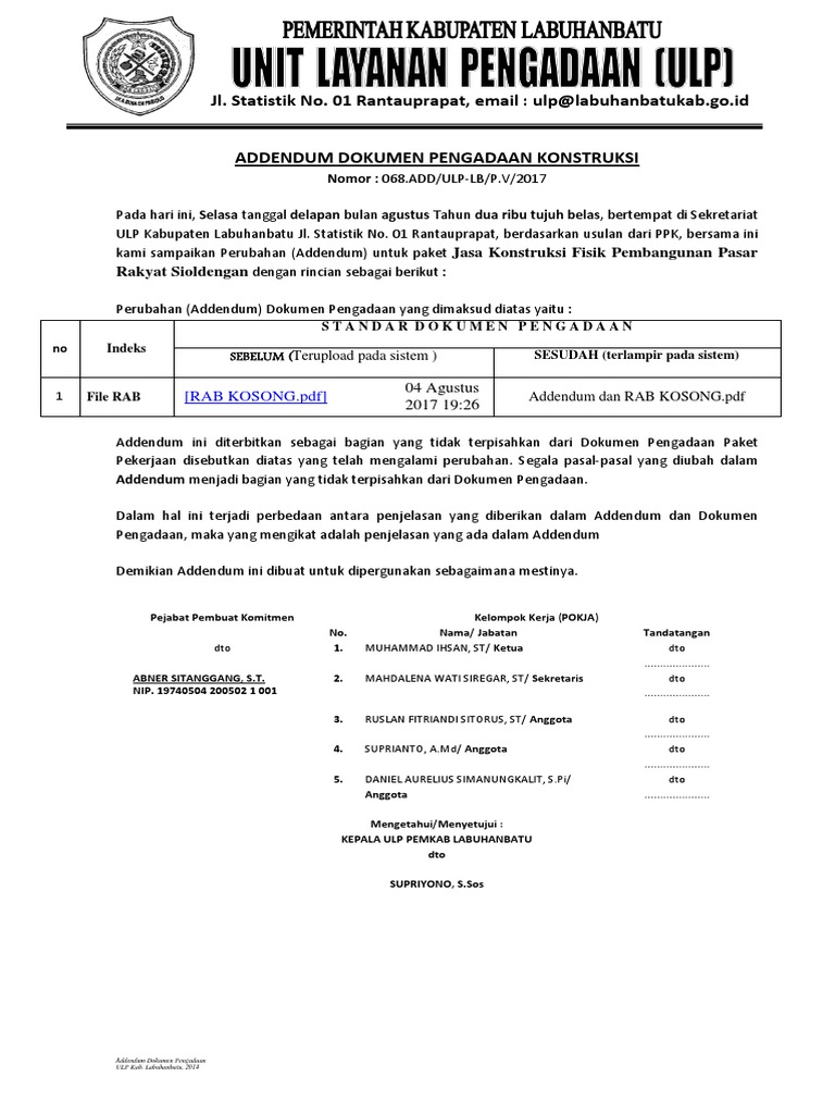 ULP Kabupaten Labuhanbatu Jl. Statistik No. 01 Rantauprapat, berdasarkan usulan dari PPK, bersama ini