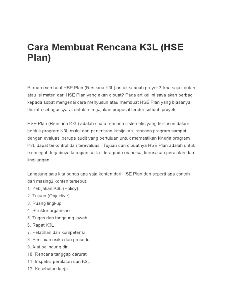 Demikian cara membuat rencana K3L (HSE Plan) versi saya. Di internet sudah