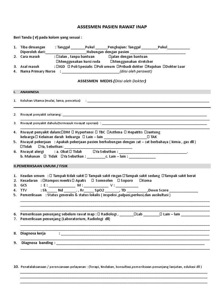1. Tiba diruangan : Tanggal _______Pukul ______Pengkajian: Tanggal ________Pukul___________