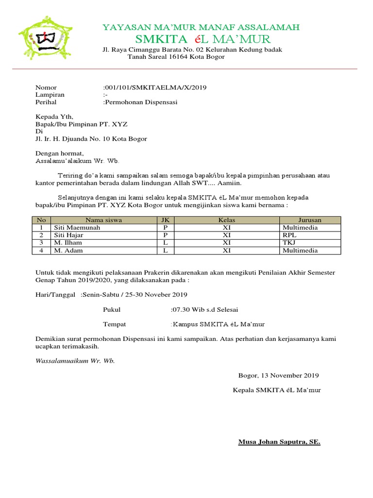 Selanjutnya dengan ini kami selaku kepala SMKITA éL Ma’mur memohon kepada