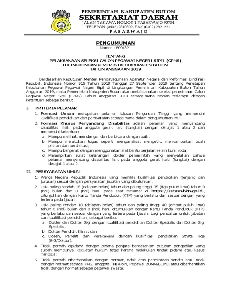 Anggaran 2019, maka Pemerintah Kabupaten Buton akan melaksanakan seleksi penerimaan Calon