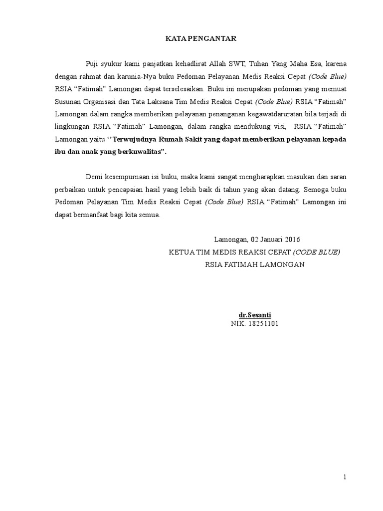 Pedoman Pelayanan Tim Medis Reaksi Cepat (Code Blue) RSIA “Fatimah” Lamongan ini