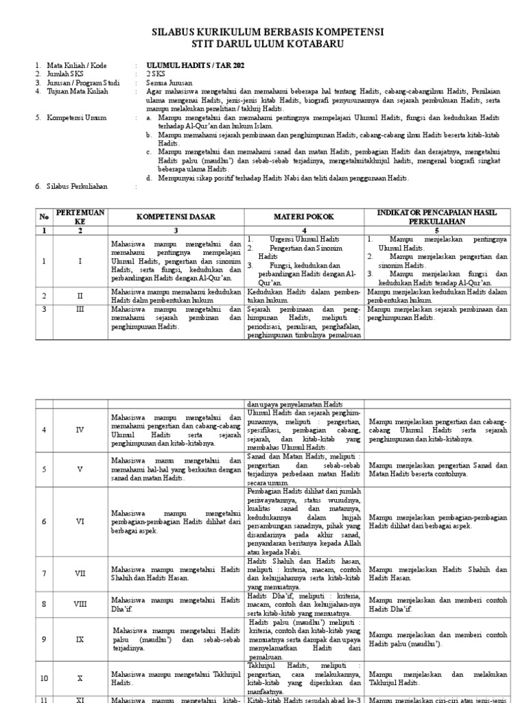 5. Kompetensi Umum : a. Mampu mengetahui dan memahami pentingnya mempelajari Ulumul Hadits, fungsi dan kedudukan Hadits