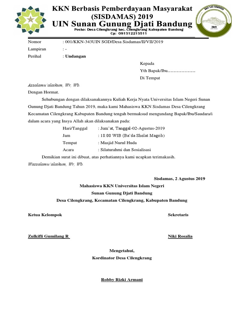 Nomor : 001/KKN-343UIN SGD/Desa Sisdamas/II/VII/2019