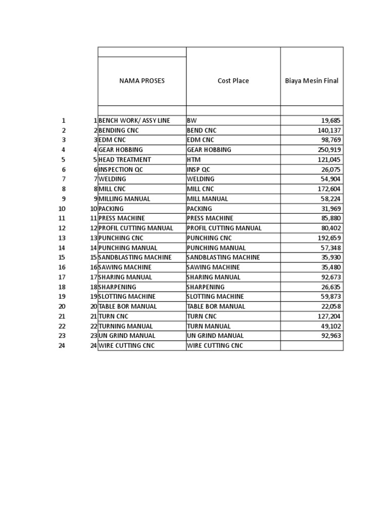 NAMA PROSES Cost Place Biaya Mesin Final