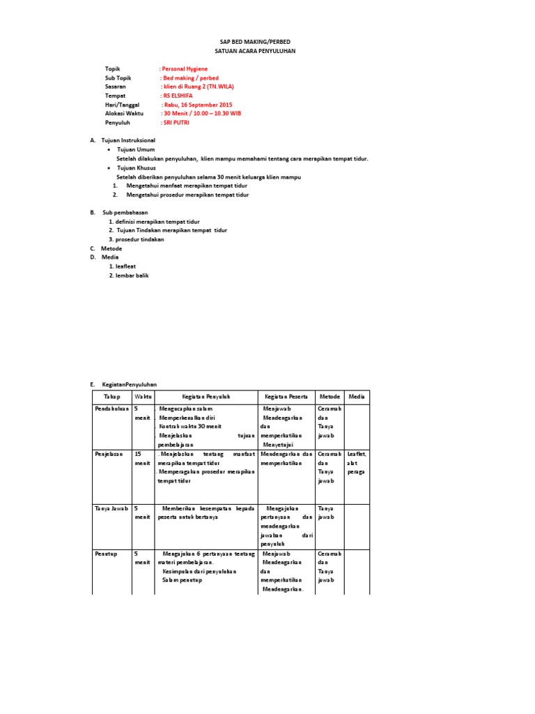 Sub Topik : Bed making / perbed