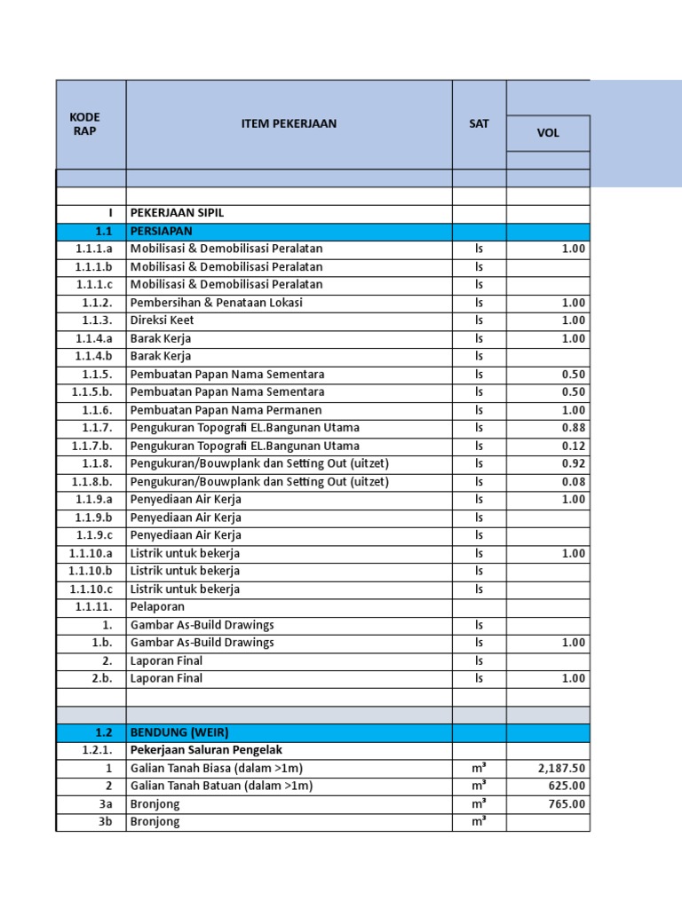 Rincian Kontrak Pekerjaan Sipil Bendung
