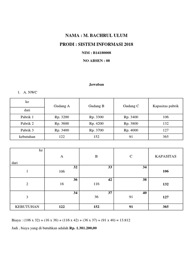 Biaya : (34 x 91) + (36 x 41) + (33 x 111) + (132 x 34) + (5 x 32) = 12.881