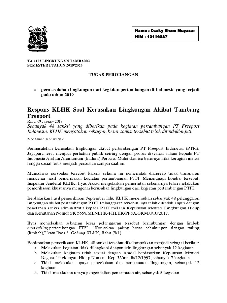 Pemberian 48 sanksi oleh KLKH kepada ptfi terkait kerusakan lingkungan akibat tambang,
