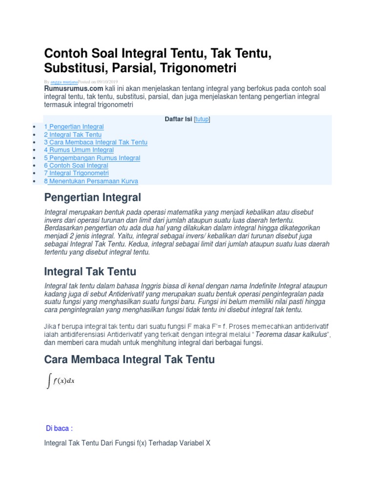 integral tentu, tak tentu, substitusi, parsial, dan juga menjelaskan tentang pengertian integral