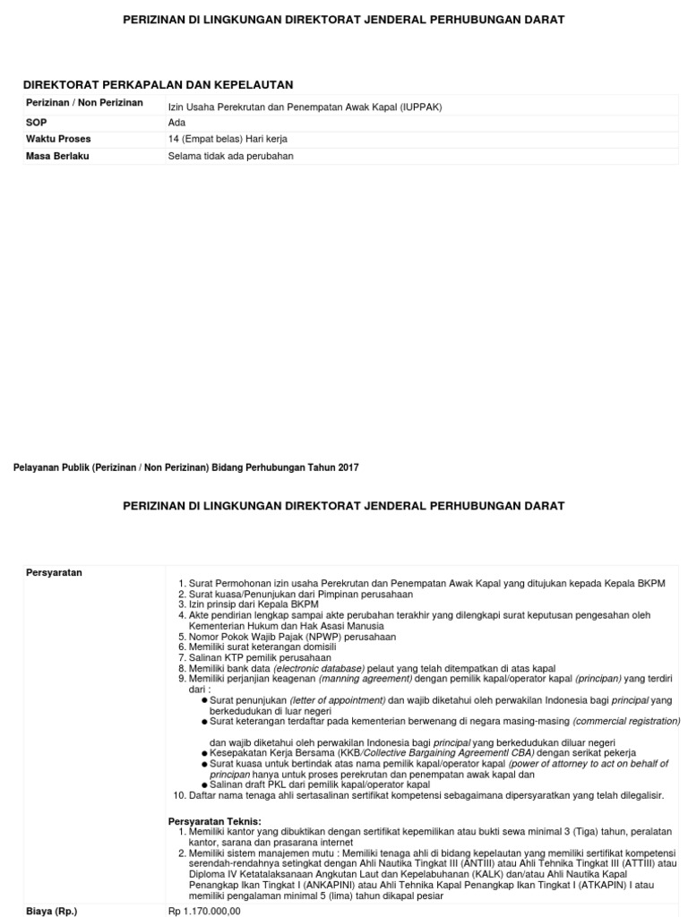 Perizinan / Non Perizinan Izin Usaha Perekrutan dan Penempatan Awak Kapal (IUPPAK)