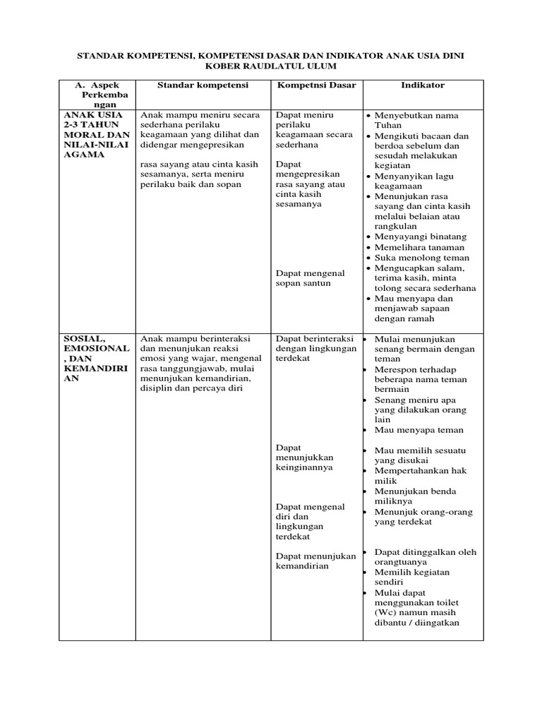 STANDAR KOMPETENSI, KOMPETENSI DASAR DAN INDIKATOR ANAK USIA DINI