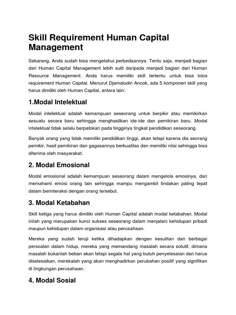requirement Human Capital. Menurut Djamaludin Ancok, ada 5 komponen skill yang