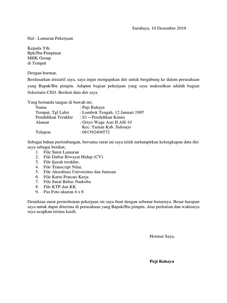 saya untuk dapat diterima di perusahaan yang Bapak/Ibu pimpin. Atas perhatian dan waktunya