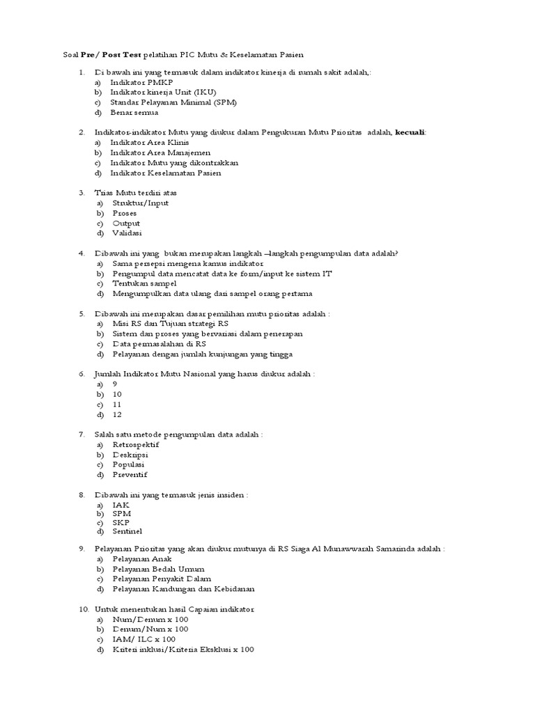 Soal Pre/ Post Test pelatihan PIC Mutu & Keselamatan Pasien
