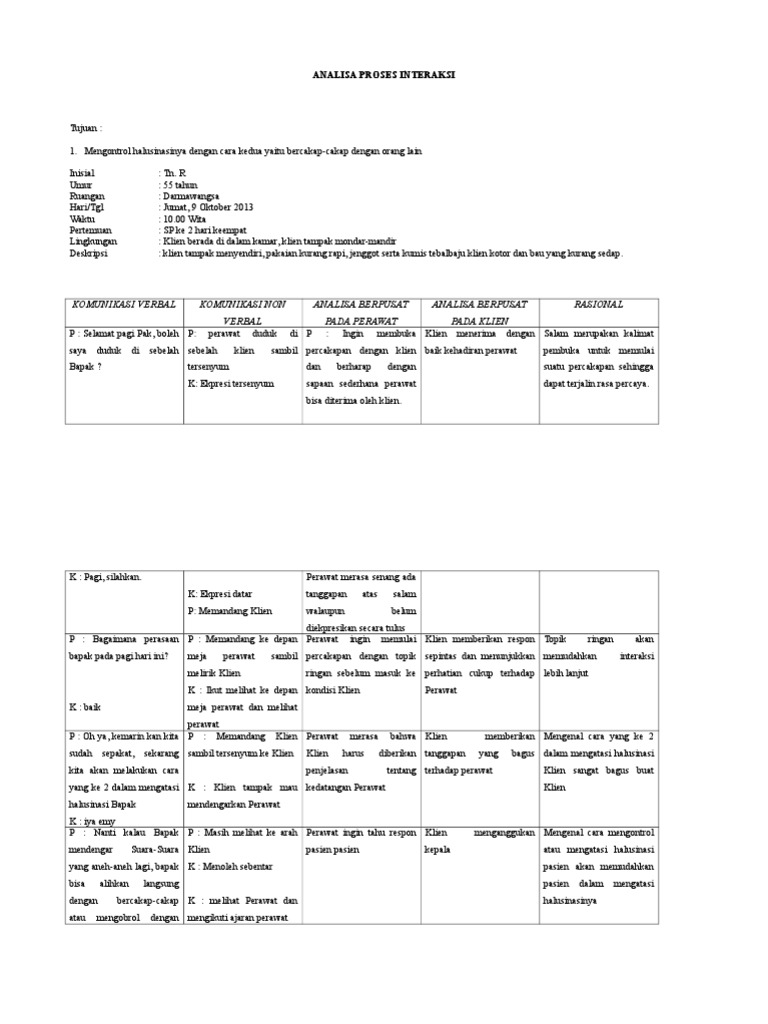 P : Bagaimana Bapak, P : Memandang Klien Perawat ingin menjalin Klien mencoba mengingat Klien mengetahui cara