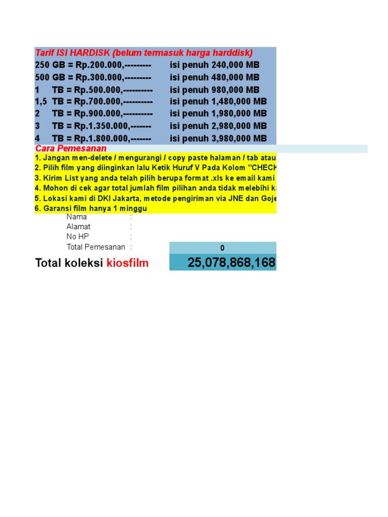 Tarif ISI HARDISK (belum termasuk harga harddisk)