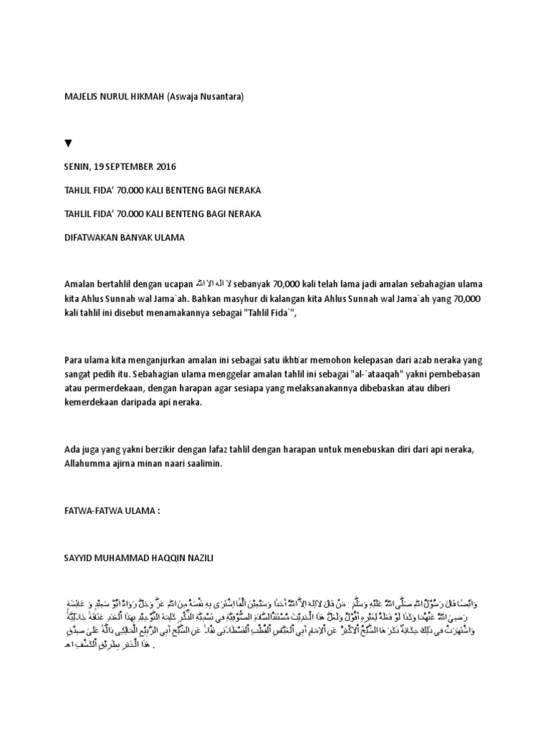 TAHLIL FIDA’ 70.000 KALI BENTENG BAGI NERAKA