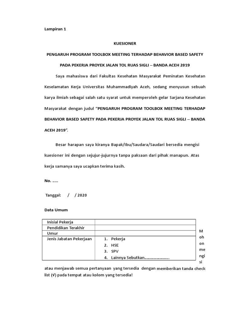 1. Apakah perusahan ada melaksanakan toolbox meeting?