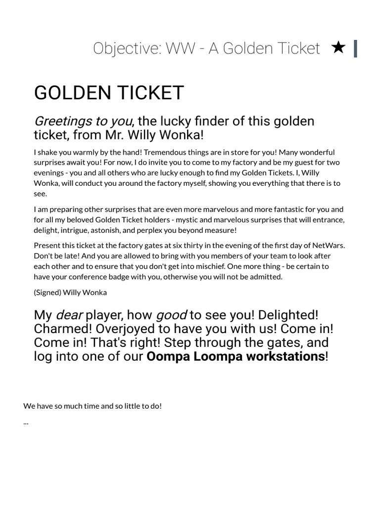Present this ticket at the factory gates at six thirty in the evening of the first day of NetWars.