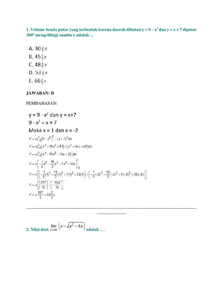 Volume benda putar yang terbentuk karena daerah dibatasi y = 9 – x2 dan y = x + 7 diputar