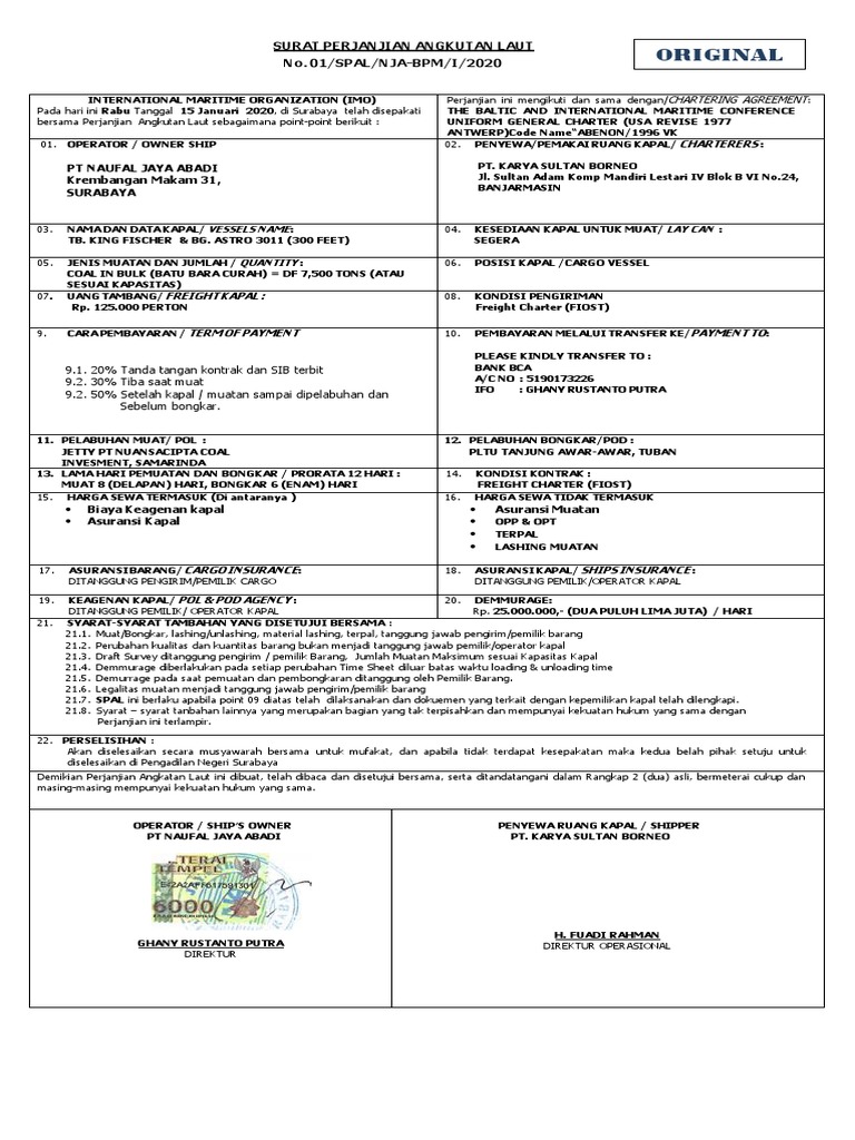 - Perjanjian SPAL ini di anggap SAH apabila pihak Pencharter telah memenuhi kewajiban / ketentuan pembayaran sebagai mana tercantum