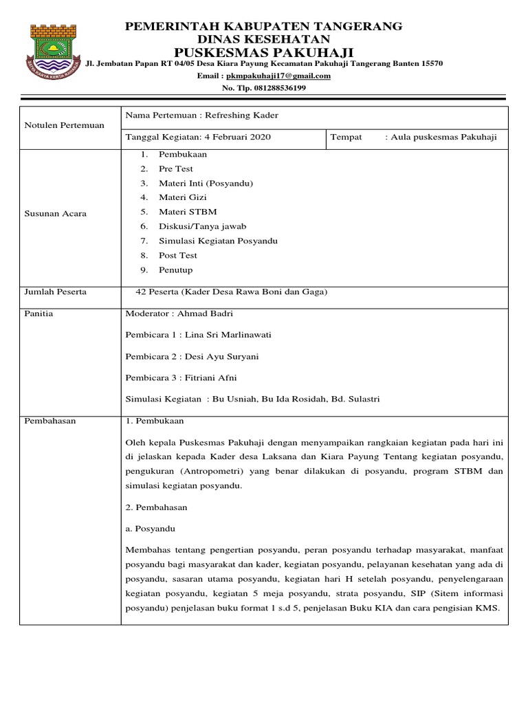 Tanggal Kegiatan: 4 Februari 2020 Tempat : Aula puskesmas Pakuhaji