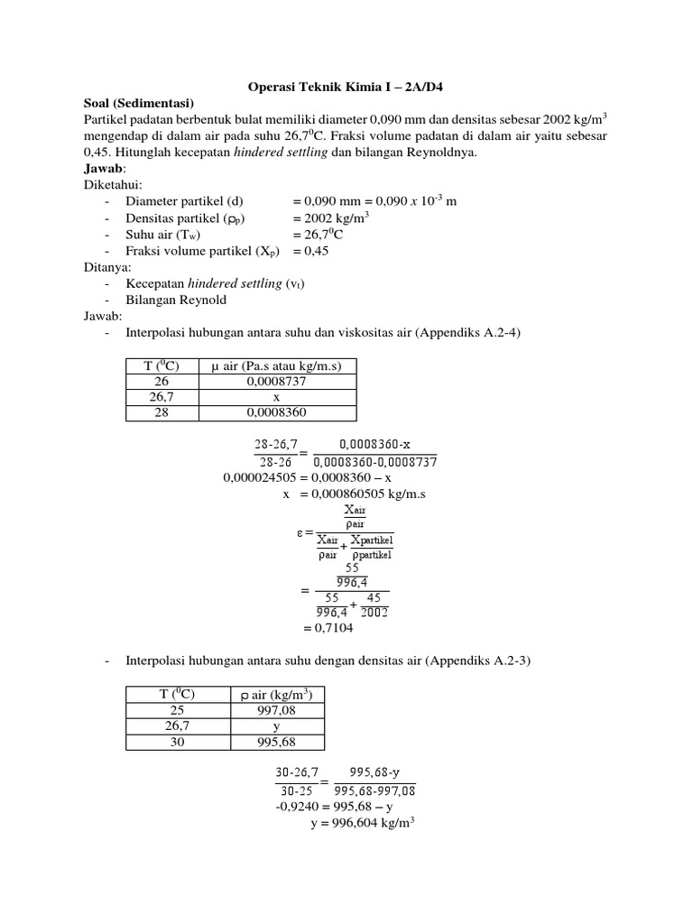 0,45. Hitunglah kecepatan hindered settling dan bilangan Reynoldnya.