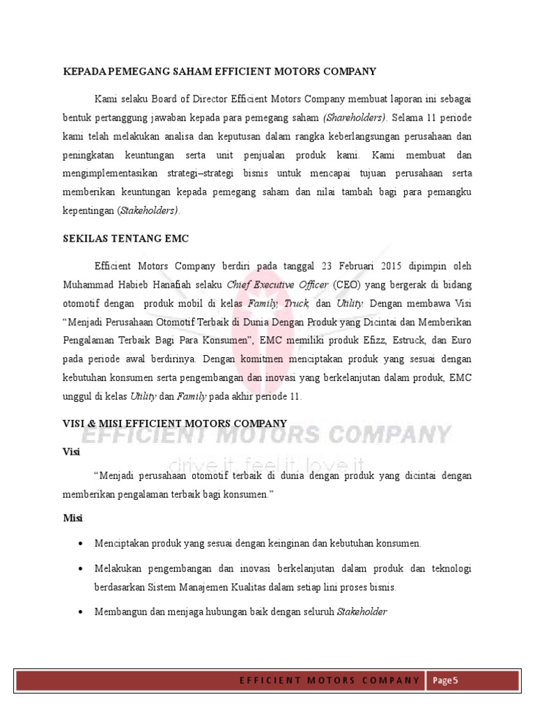 Kami selaku Board of Director Efficient Motors Company membuat laporan ini sebagai