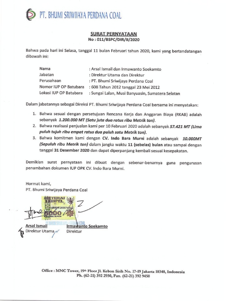 Dalam jabatannya sebagai Direksi PT. Bhumi Sriwijaya Perdana Coal bersama ini menyatakan: