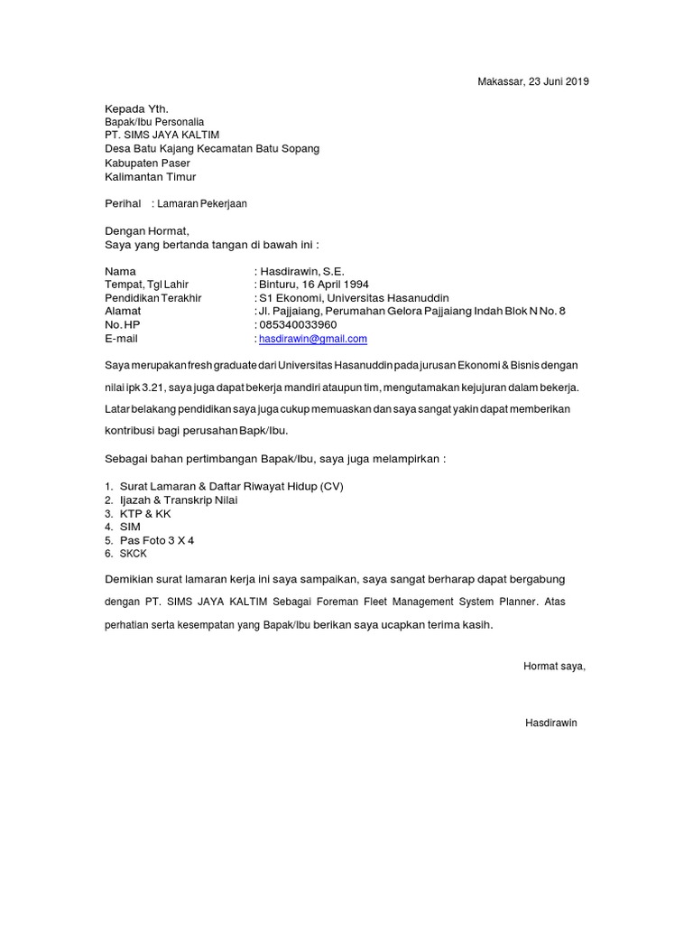 1. Surat Lamaran & Daftar Riwayat Hidup (CV)