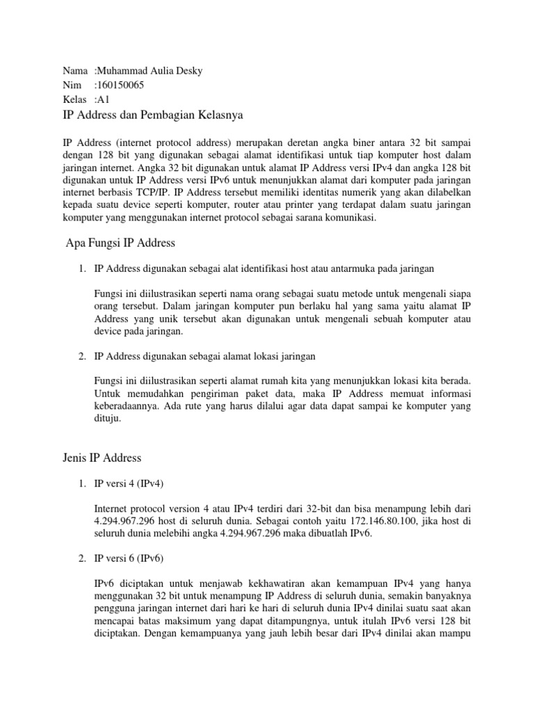 pada ukuran dan jumlah. IP Address kelas A jaringan. IP Address Kelas B digunakan untuk