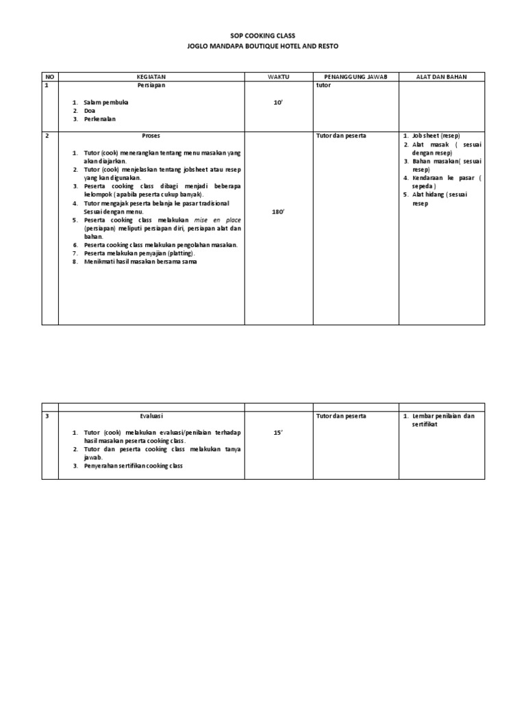 SOP COOKING CLASS