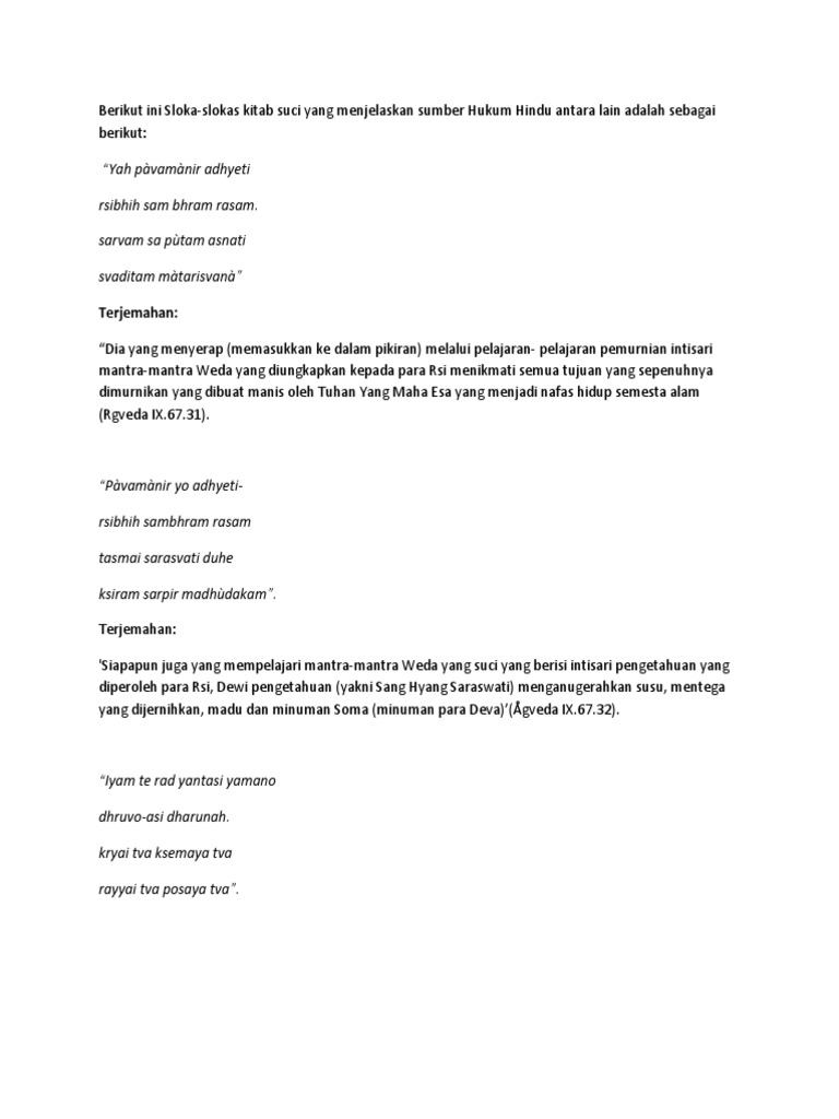 Berikut ini Sloka-slokas kitab suci yang menjelaskan sumber Hukum Hindu antara lain adalah sebagai
