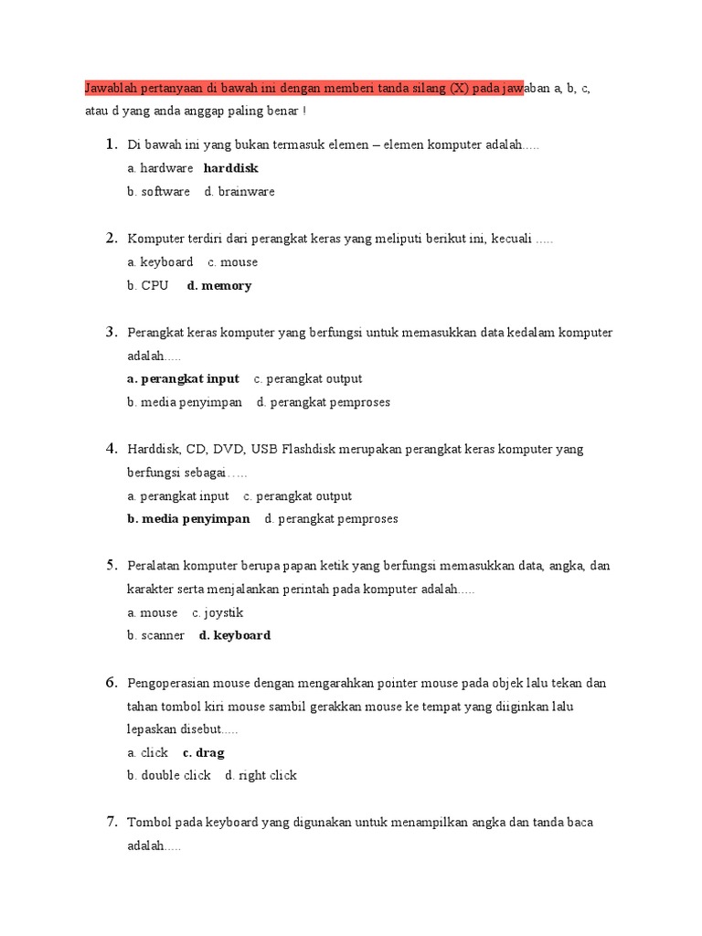 Jawablah pertanyaan di bawah ini dengan memberi tanda silang (X) pada jawaban a, b, c,